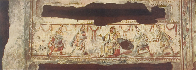 황금 · 유향 · 몰약 세 가지 예물에서 연상한 숫자, 실제론 온 인류를 상징 - 네 명의 동방 박사가 아기 예수님을 경배하는 모습을 표현한 로마 성 베드로와 마르첼리노 카타콤바의 <동방 박사의 경배>