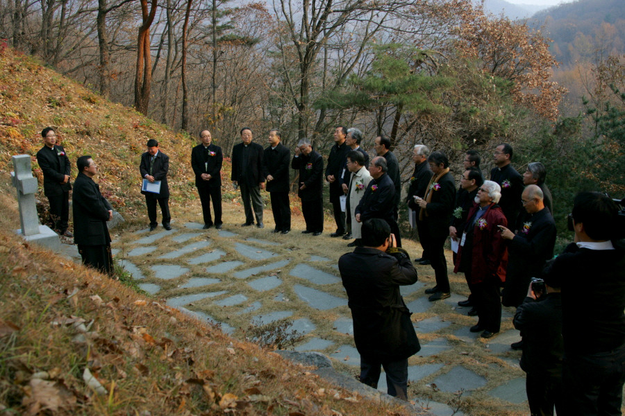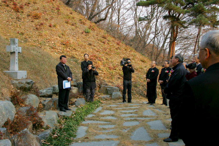 무명 순교자 14인 묘소앞에서 소개 말씀하시는 신부님
