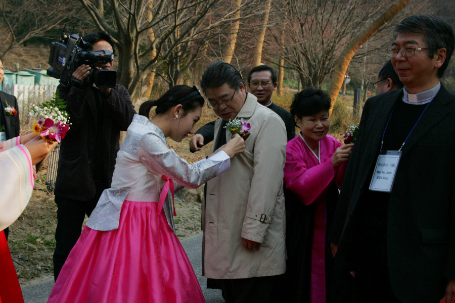 주교님들에게 꽃을 달아드리는 모녀 꽃소녀님.