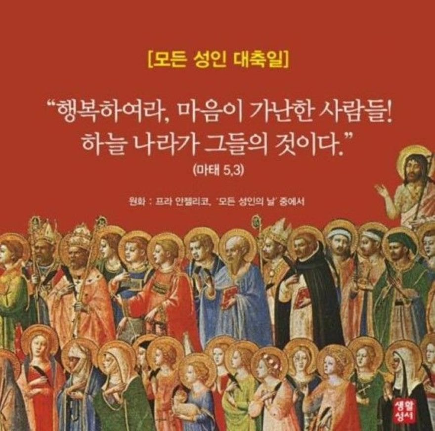 2025년 11월 1일 토요일 [(백) 모든 성인 대축일] 오늘 전례 오늘은 하늘 나라의 모든 성인을 기리는 대축일로, 하느님과 함께 영광을 누리는 성인들의 모범을 본받고자 다짐하는 날이다. 특히 전례력에 축일이 따로 지정되지 않은 성인들을 기억하고 기린다. 이 축일은 동방 교회에서 먼저 시작되어 609년 성 보니파시오 4세 교황 때부터 서방 교회에서도 지내게 되었다. 처음에는 5월 13일 이었는데, 9세기 중엽에 11월 1일로 바뀌었다. 교회는 이날 그리스도인들 에게 죽음 뒤의 새로운 삶을 바라며 보여 주고, 우리와 천국의 모든 성인 사이의 연대성도 깨우쳐 준다. 성인들은 하늘 나라에서 하느님을 직접 뵈며 영원한 행복을 누립니다. 하늘 나라의 성인들을 기리며 전구를 청합시다. 예수 그리스도의 죽음과 부활을 굳게 믿는 우리도, 희망을 안고 성인들처럼 하느님을 뵐 그날까지 열심히 살아갑시다. 제1독서 <내가 보니, 아무도 수를 셀 수 없을 만큼 큰 무리가 있었습니다. 그들은 모든 민족과 종족과 백성과 언어권에서 나온 사람들이었습니다.> 7,2-4.9-14 나 요한은 2 다른 한 천사가 살아 계신 하느님의 인장을 가지고 해 돋는 쪽에서 올라오는 것을 보았습니다. 네 천사에게 큰 소리로 외쳤습니다. 이마에 인장을 찍을 때까지 땅도 바다도 나무도 해치지 마라.” 십사만 사천 명이라고 들었습니다. 자손들의 모든 지파에서 나온 사람들이었습니다. 수를 셀 수 없을 만큼 큰 무리가 있었습니다. 모든 민족과 종족과 백성과 언어권에서 나온 그들은, 야자나무 가지를 들고서 어좌 앞에 또 어린양 앞에 서 있었습니다. 하느님과 어린양의 것입니다.” 원로들과 네 생물 둘레에 서 있다가, 엎드려 하느님께 경배하며 12 말하였습니다. “아멘. 우리 하느님께 찬미와 영광과 지혜와 감사와 영예와 권능과 힘이 누구이며 어디에서 왔느냐?” 하고 계시지 않습니까?” 하고 내가 대답하였더니, 그가 나에게 말하였습니다. “저 사람들은 큰 환난을 겪어 낸 사람들이다. 긴 겉옷을 깨끗이 빨아 희게 하였다.” 화답송 시편 24(23),1-2.3-4ㄱㄴ.5-6 (◎ 6 참조) 세대이옵니다. 온 땅과 그 안에 가득 찬 것들, 온 누리와 그 안에 사는 것들. 그분이 물 위에 세우시고, 강 위에 굳히셨네. ◎ 주님, 이들이 당신 얼굴을 찾는 세대이옵니다. 누가 그 거룩한 곳에 설 수 있으랴? 손이 깨끗하고 마음이 결백한 이, 헛된 것에 정신을 팔지 않는 이라네. ◎ 주님, 이들이 당신 얼굴을 찾는 세대이옵니다. 구원의 하느님께 의로움을 얻으리라. 이들이 야곱이라네. 그분을 찾는 세대, 그분 얼굴을 찾는 세대라네. ◎ 주님, 이들이 당신 얼굴을 찾는 세대이옵니다. 제2독서 <우리는 하느님을 있는 그대로 뵙게 될 것입니다.> 3,1-3 사랑하는 여러분, 얼마나 큰 사랑을 주시어 되었는지 생각해 보십시오. 까닭은 세상이 그분을 알지 못하였기 때문입니다. 하느님의 자녀입니다. 우리가 어떻게 될지는 아직 드러나지 않았지만, 그분께서 나타나시면 우리도 그분처럼 되리라는 것은 알고 있습니다. 그분을 있는 그대로 뵙게 될 것이기 때문입니다. 사람은 모두,그리스도께서 순결하신 것처럼 자신도 순결하게 합니다. 복음 환호송 마태 11,28 참조 고생하며 무거운 짐을 진 너희는 모두 나에게 오너라. 내가 너희에게 안식을 주리라. 복음 <기뻐하고 즐거워하여라. 너희가 하늘에서 받을 상이 크다.> 5,1-12ㄴ 그때에 1 예수님께서는 군중을 보시고 산으로 오르셨다. 그분께서 자리에 앉으시자 제자들이 그분께 다가왔다. 그들을 이렇게 가르치셨다. 하늘 나라가 그들의 것이다. 그들은 위로를 받을 것이다. 그들은 땅을 차지할 것이다. 주리고 목마른 사람들! 그들은 흡족해질 것이다. 그들은 자비를 입을 것이다. 그들은 하느님을 볼 것이다. 그들은 하느님의 자녀라 불릴 것이다. 박해를 받는 사람들! 모욕하고 박해하며, 너희를 거슬러 거짓으로 온갖 사악한 말을 하면, 너희는 행복하다! 너희가 하늘에서 받을 상이 크다.” 영성체송 마태 5,8-10 그들은 하느님을 보리라. 행복하여라, 평화를 이루는 사람들! 그들은 하느님의 자녀라 불리리라. 행복하여라, 의로움 때문에 박해를 받는 사람들! 하늘 나라가 그들의 것이다.