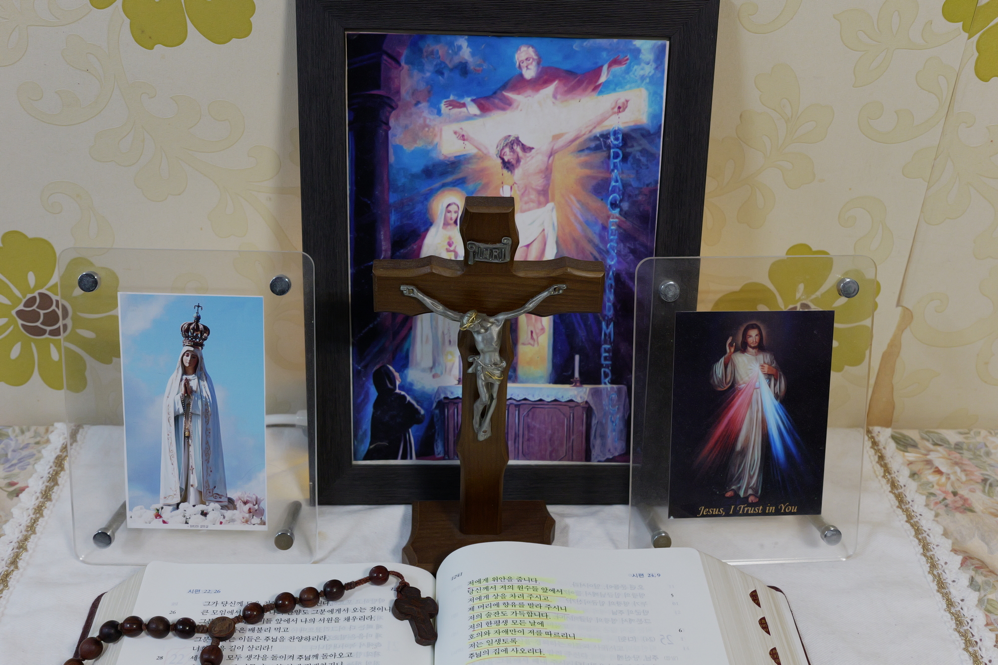 - 예수님께서 십자가에 못박혀 물과 피를 흘리시는 고통중에 말씀하심. - 주님의 기도, 성모송 제7화) " 나의 주님, 예수의 부활을 기다리나이다 " - 성모님께서 예수님의 시신을 돌무덤에 장사지내시고 부활을 기다리심. - 주님의 기도, 성모송 제8화) " 어머니, 구원이 왔습니다 " - 예수님께서 부활하시고 성모님에게 나타나시어 구원이 왔슴을 알리심 - 주님의 기도, 성모송 제9화) " 내가 너희에게 명령한 모든 것을 가르쳐 지키게 하여라" " 보라, 내가 세상 끝날까지 언제나 너희와 함께 있겠다” - 예수님께서 첫미사를 드리시고, 가르친 모든것을 지키라 제자들에게 명하심. - 주님의 기도, 성모송 * 마침기도 은혜로우신 하느님, 예수님께서는 십자가 수난의 죽음과 부활을 통하여 인류의 구원을 이루고 당신께 영광을 드리셨나이다. 예수님, 주님을 사랑하고 당신의 일을 실천하는 사람들에게 당신을 기쁘게 드러내소서. 성모님, 예수님을 사랑하는 사람들에게 당신을 드러내소서 예수님을 사랑하나 당신을 알지못하는 사람들이 많습니다. 저희들의 기도와 희생을 성부 하느님께 드리시는 예수님, 죄에 물들어있는 저희들의 난쏘공 같은 기도가 거룩하신 성부 하느님께 닿도록 인도하소서. 또한 영원한 도움의 공경하올 성모님께서도 저희들을 위하여 기도하소서. 사랑과 정의의 성부 하느님, 저희들의 죄악이 당신의 정의를 일깨우고 의노를 불러 일으키지만 당신께서는 사랑을 더욱 좋아하시고 즐겨하시나이다. 작고 약한 저희들의 간절한 기도를 사랑으로 받으시고 거룩하신 당신의 사랑으로 저희들을 이끌어주소서. 아멘.