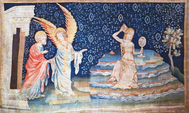 - 프랑스 앙제 성(城)에 전시된 요한 묵시록 태피스트리 중 <바빌론의 대탕녀>(부분). 위키미디어문제는 16절에서 발생한다. 대탕녀 바빌론이 오히려 열 뿔과 짐승에게 공격당한다. 앞서 그녀와 가까이 붙어 있던 세력들이 돌연히 등을 돌리는 장면이다. 역사적 해석은 이것을 로마를 위협하던 주변 민족들의 저항으로 읽기도 한다. 그러나 요한 묵시록이 말하는 것은 특정 전투의 기록이 아니라, 악의 내부에서 시작되는 자멸의 논리이다. 로마 제국은 요한 묵시록의 시대에 멸망하지 않았다. 그러므로 요한이 그린 파멸은 실제 역사적 사건이 아니라, ‘세상의 화려한 권력이 곧 허무의 다른 이름’이라는 묵시적이고 영성적인 통찰에 가깝다.