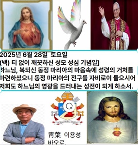 2025년 6월 28일 토요일 (백) 티 없이 깨끗하신 성모 성심 기념일 비오 12세 교황께서는 1942년 성모님의 파티마 발현 25주년을 맞아 ‘티 없이 깨끗하신 성모 성심’께 세상을 봉헌하시고 이 기념일을 온 교회가 지내게 하셨다. 처음에는 8월 22일에 선택 기념일로