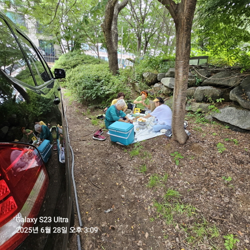 드디어 비가 금세라도 쏟아질 판이라... 자동차옆 평평한 잔디위 나무그늘에
