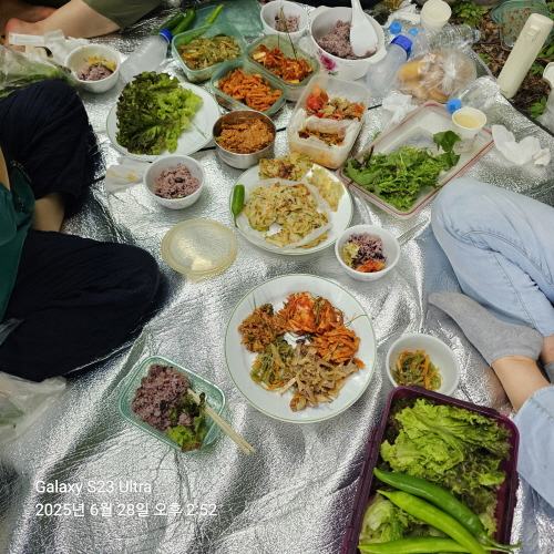 돗자리 깔고 오늘의 만찬상을 펼치며... 좀 전의 연꽃 핫도그는 잊어버린채