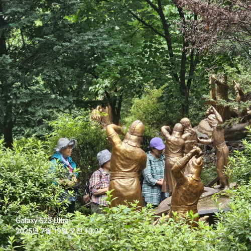 데크길 숲길에 앉아 옷 걷어올리고 쉬~하는 엉거주춤한 여인의 돌 조각 작품을 보는 순간..