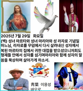 2025년 7월 29일 화요일 [(백) 성녀 마르타와 성녀 마리아와 성 라자로 기념일 마르타와 마리아와 라자로는 형제 사이로, 예루살렘과 가까운 베타니아에서 살았다. 그들은 베타니아의 자기 집에 오신 예수님을 열렬히 환대하여, 마르타는 정성껏 시중을 들고 마리아는 그분의 말씀을 경건하게 들었다. 그들을 특별히 사랑하신 예수님께서는 라자로의 죽음에 눈물을 흘리셨고, 그를 죽음에서 부활시키셨다.본디 7월 29일은 ‘성녀 마르타 기념일’이었으나, 2021년부터 ‘성녀 마르타와