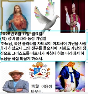 2025년 8월 11일 월요일 (백) 성녀 클라라 동정 기념일 클라라 성녀는 1194년 이탈리아 아시시의 한 귀족 가문에서 태어났다. 프란치스코 성인의 복음적 생활에 감명을 받은 그는 수도 생활에 대한 열망으로 클라라 수도회를 세웠다. 수도 생활에 대한 집안의 반대가 심하였으나, 오히려 동생 아녜스마저 언니 클라라를 따라 수도자가 되었다. 클라라 성녀는 프란치스코 성인을 본받아 철저하게 가난하고 겸손한 삶을 살았다. 그는 1253년에 선종하였으며, 알렉산데르 4세교황께서 1255년에 시성하셨다