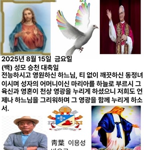 2025년 8월 15일 금요일 [(백) 성모 승천 대축일 오늘은 성모 승천 대축일입니다. 하느님께서는 성자의 어머니 복되신 동정 마리아를 하늘로 불러올리셨습니다. 당신 종의 비천함을 굽어보신 하느님 안에서 우리도 기뻐하며, 여인들 가운데에서 가장 복되신 동정 마리아의 승천으로 우리에게 희망을 주신 하느님을 찬미합시다. † 성부와 성자와 성령의 이름으로 아멘.