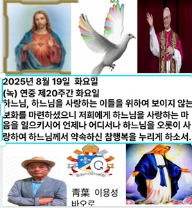 2025년 8월 19일 화요일 (녹) 연중 제20주간 화요일 보소서, 저희 방패이신 하느님. 그리스도의 얼굴을 굽어보소서. 당 신 뜨락에서 지내는 하루가 .다른 천 날보다 더 좋사옵니다.