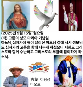 2025년 9월 15일 월요일 (백) 고통의 성모 마리아 기념일 이날은 예수님의 십자가 길을 함께하신 성모님의 고통을 기억하는 날이다. 일찍이 시메온은 성모님의 고통을 예언하였다. “이 아기는 이스라엘에서 많은 사람을 쓰러 지게도 하고 일어나게도 하며, 또 반대를 받는 표징이 되도록 정해졌습니다. 그리하여 당신의 영혼이 칼에 꿰찔리는 가운데, 많은 사람의 마음속 생각이 드러날 것입니다”(루카 2,34-35). 성모님의 고통을 묵상하고 기억하는 신심은 오래전부터 널리 퍼져 있었으며, 1688년 인노첸시오 11세 교황께서 이 기념일을 정하셨다. 1908년 성 비오 10세 교황께서는 ‘성 십자가 현양 축일’ 다음 날인 9월 15일로 이 기념일을 옮기고