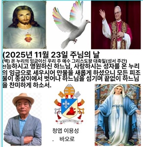 2025년 11월 23일 주님의 날 (백) 온 누리의 임금이신 우리 주 예수 그리스도왕 대축일 (성서 주간) 오늘은 온 누리의 임금이신 우리 주 예수 그리스도왕 대축일입니다. 하늘과 땅의 모든 권한을 받으신 그리스도께서 우리의 왕이심을 기리는 날입니다. 그분의 다스림은 절대 권력의 행사가 아니라 바로 인간의 구원을 위하여 이웃을 섬기는 일입니다. 하느님께서는 그리스도를 왕으로 세우시고 그분의 십자가를 통하여 만물을 화해시키시어 우리가 하늘 나라에서 당신의 영광을 누릴 수 있게 하십니다.