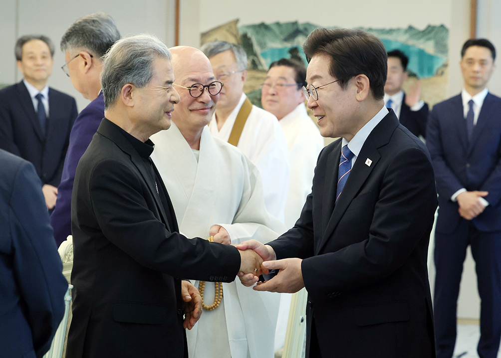 지난해 7월 열린 종교 지도자 초청 오찬 간담회에서 이재명 대통령과 한국천주교 주교회의 의장 이용훈 주교를 비롯한 종교 지도자들이 인사를 나누고 있다. 뉴시스 / 대통령실통신사진기자단