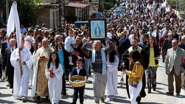 레바논 마론파 가톨릭 사제인 피에르 알 라히 신부 (왼쪽에서 두번째)가 2023년 4월 2일 레바논 클라야에서 열린 성지주일 행렬에 참여하고 있다. 알 라히 신부는 2026년 3월 9일 레바논 남부 클라야 마을에서 이스라엘 포병 탱크의 포격으로 한 가옥이 파괴되면서 사망했다. OSV