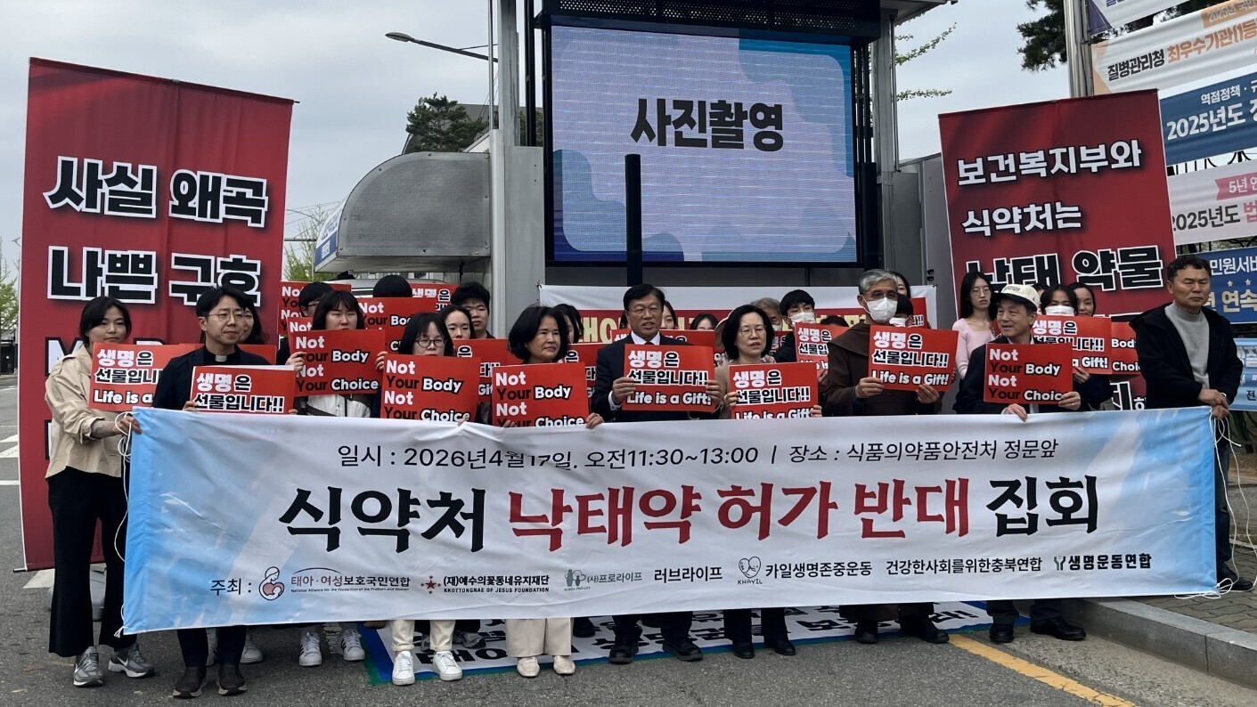 생명운동연합과 태아·여성보호국민연합 등 생명운동 단체들이 17일 식약처 앞에서 낙태약 허가 반대 집회를 열고 있다. 태여연 제공 정부가 최근 규제 합리화 차원에서 임신중지 약물, 이른바 '낙태 약물' 도입 허용을 촉구하고 나섰다. 천..