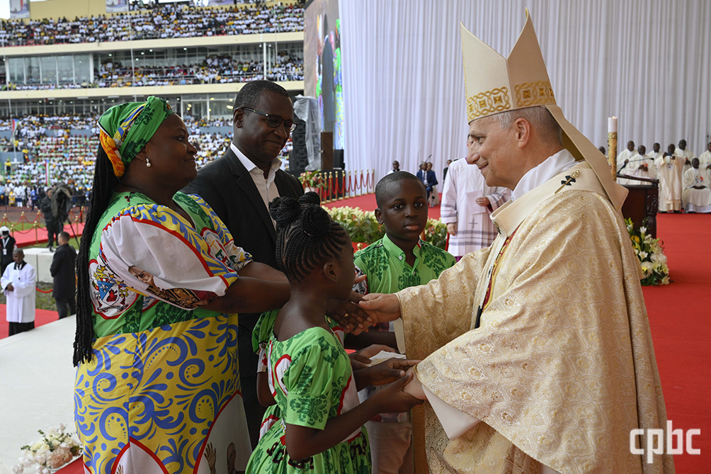 레오 14세 교황이 4월 23일 적도 기니 말라보 스타디움에서 미사를 봉헌한 후 현지 신자 가족들의 알현을 받으며 축복하고 있다. OSV 명 레오 14세 교황이 4월 23일 적도 기니 말라보 스타디움에서 미사를 주례하기 위해 입당하며 신자들을 ..