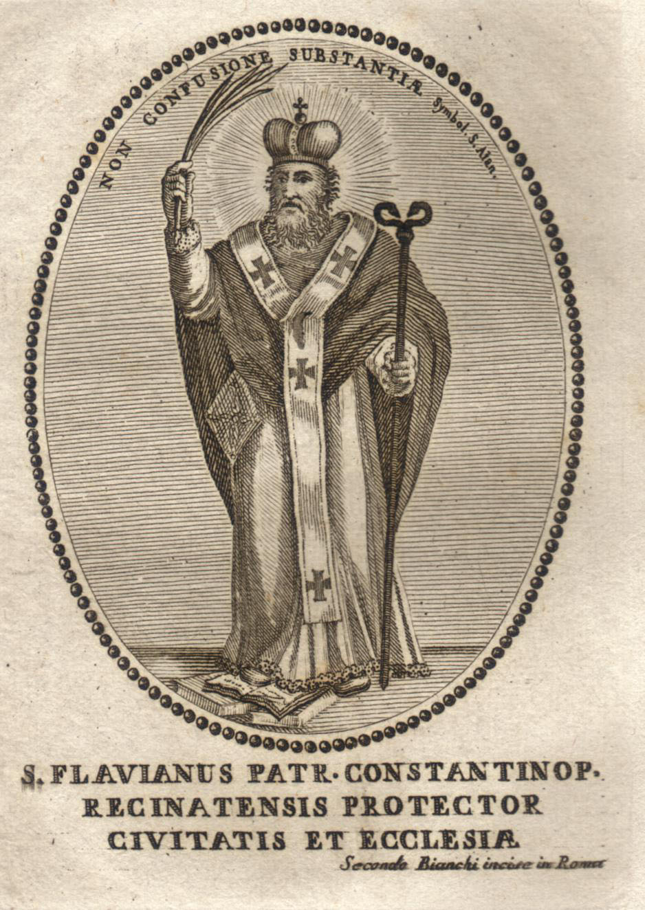 성 플라비아누스(Flavianus, 또는 플라비아노)는 콘스탄티노플의 사제로 교구의 재무를 담당하고 있었다. 그 이전의 그의 출신과 경력에 대해서는 알려진 바가 없다. 그는 446년에 성 프로클로(Proclus, 10월 24일)를 계승하여 콘스탄티노플의 총대주교로 승품되었다. 그런데 취임 초에 그는 테오도시우스 2세 황제(408~450년 재위)의 대관식에 특별한 선물을 보내라는 환관 크리사피우스(Chrysaphius)의 제안을 거부해 큰 공경에 빠진 적이 있었다. 게다가 448년에 교회 회의를 소집해 그리스도의 두 가지 본성인 신성(神性)과 인성(人性)이 하나의 위격(位格)으로 존재함을 부인하는 그리스도 단성론(單性論)을 주장하던 에우티케스(Eutyches) 대수도원장의 가르침을 이단으로 단죄하고 그의 사제직을 박탈했다. 에우티케스는 환관 크리사피우스의 대부였고, 동로마 제국의 황제인 테오도시우스 2세의 지지를 받고 있었기 때문에 그의 결정은 큰 파문을 일으켰다. 에우티케스는 이런 결정에 불복해 로마(Roma)에 상소했으나 교황 성 대 레오 1세(Leo I, 11월 10일)는 정통교리를 고수하고자 노력한 성 플라비아노 총대주교의 용기를 격찬하는 장문의 친서(Tomus ad Flavianum)를 보냈다. 이 교리 서한은 “레오의 친서”(Tome of Leo)라는 이름으로 전해오는 유명한 문서로 그리스도론에 대한 단성설 이단 논쟁이 있을 때마다 판단 기준으로 제시되었었다. 황제 측은 이에 분개하여 알렉산드리아(Alexandria)의 총대주교인 디오스코루스 1세(Dioscorus I) 주도로 449년에 에페수스(Ephesus) 공의회를 소집했지만, 교황은 이를 ‘강도 공의회’(Robber Council)로 규정하였다. 하지만 황제의 측근들은 에우티케스의 주장을 교리로 선포하고 성 플라비아노를 강제로 주교좌에서 끌어내리고 유배형에 처했다. 결국 성 플라비아노는 리디아(Lydia, 소아시아 아나톨리아 지방의 역사적 지역으로 오늘날 튀르키예의 서부 지역)의 히파에파(Hypaepa)로 끌려가 심한 매질을 당한 후 감옥에 갇혔다가 얼마 후 숨을 거두었다. 그래서 그는 순교자로도 불린다. 가톨릭 정통신앙을 옹호하다가 디오스코루스 추종자들과 황제의 군사들에게 심한 구타와 고문을 당하고 그 후유증으로 감옥에서 사망했기 때문이다. 450년에 에우티케스를 지지하던 테오도시우스 2세 황제가 사망하고, 451년에 개최된 칼케돈(Chalcedon) 공의회는 에우티케스를 단죄하고 성 레오 교황의 친서를 확인하며, 성 플라비아노를 성인이자 순교자로 선포하였다. 옛 “로마 순교록”은 2월 18일 목록에서 그에 대해 전해주었으나 2001년 개정 발행되어 2004년 일부 수정 및 추가한 “로마 순교록”은 2월 17일로 옮겨 에페수스에서 가톨릭 신앙을 수호했다는 이유로 디오스코루스 추종자들에게 매를 맞고 추방된 성 플라비아노 주교가 3일 만에 목숨을 잃었다고 기록하였다.♣