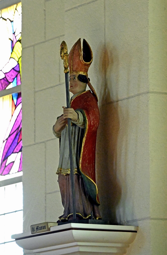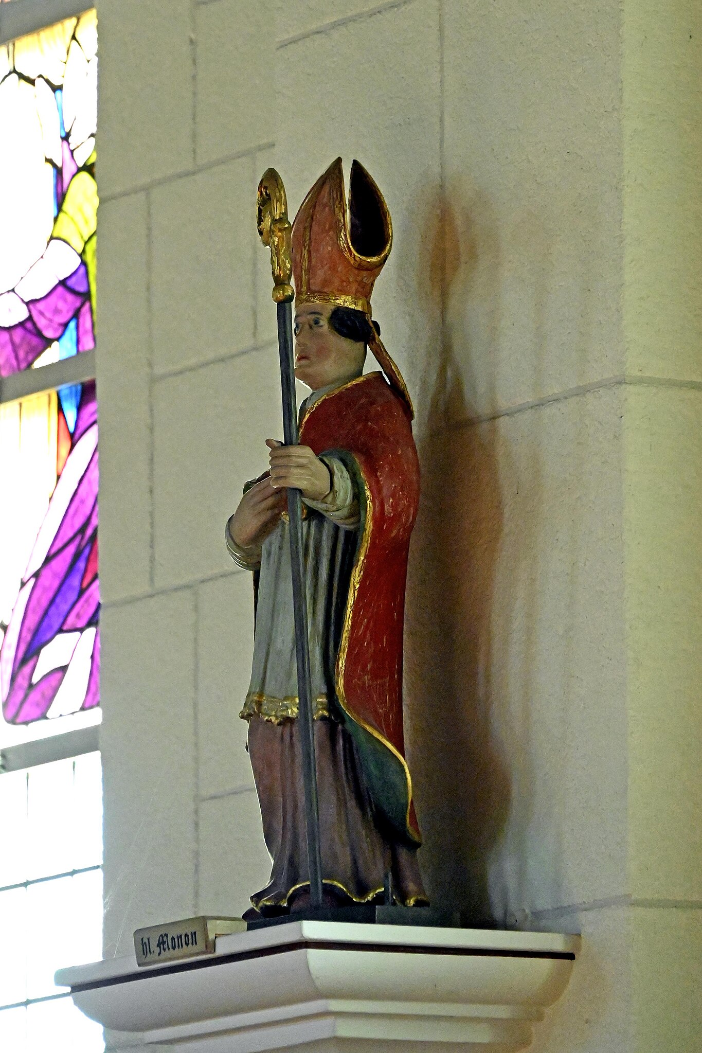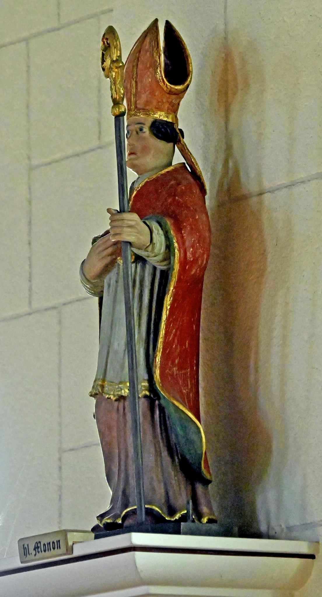 성 모논은 600년경 스코틀랜드 또는 아일랜드의 부유한 가정에서 태어나 그리스도교 신앙 교육을 받으며 성장했다. 어려서부터 사제가 되기를 원했던 그는 어느 날 천사로부터 갈리아 지방 아르덴(Ardennes) 숲으로 가서 주민들에게 복음을 전하라는 말씀을 들었다. 그는 로마(Roma)에 있는 사도들의 무덤을 방문하고 나서 오늘날 벨기에 남동부와 프랑스 북동부에 걸쳐 있는 아르덴 숲으로 들어가서 은수자로 살며 사람들로부터 높은 존경을 받았다. 그는 오늘날 벨기에 영토에 속한 아르덴 숲의 나소뉴에 은둔소를 세웠다. 그의 명성을 듣고 많은 이들이 찾아오면서 이교 숭배를 수입원으로 삼던 인근 마을 주민들에 의해 살해되었다고 하고, 다른 전승에 따르면 올바른 삶을 살도록 권고받은 도적들에 의해 희생되었다고 한다. 그래서 그는 순교자로서 공경받았고, 그의 무덤은 순례지가 되어 많은 이들의 회심과 기적이 일어나는 장소가 되었다. 통에런(Tongeren)의 주교는 그의 무덤 위에 성모 마리아에게 봉헌하는 성당을 세웠고, 나중에 그의 이름을 따서 생모농(Saint-Monon) 성당으로 변경되었다. 2001년 개정 발행되어 2004년 일부 수정 및 추가한 “로마 순교록”은 10월 18일 목록에 오늘날 벨기에 영토인 나소뉴에서 아르덴 숲의 은수자이자 순교자인 성 모논을 기념한다고 기록하였다. 성 모논은 성 모노(Mono) 또는 성 무노(Muno)로도 불린다.♣