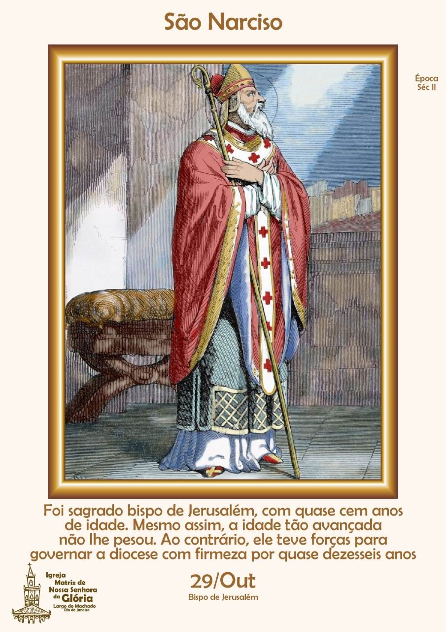 성 나르키수스(또는 나르치소)는 그리스 사람으로 2세기 초에 태어났다. 그가 190년경 예루살렘의 제3대 주교로 임명되었을 때 이미 그 누구보다도 나이가 많은 사람이었는데, 그 이전의 행적에 대해서는 알려진 바가 없다. 그는 교구 내의 규율을 엄격히 실시하여 명성을 얻었다. 그리고 부활절 날짜를 정하기 위해 팔레스티나의 카이사레아(Caesarea)에서 열린 회의를 이끌며 니산(Nisan)달 14일인 만월(滿月)이 지난 후 첫 번째 주일(일요일)에 부활절을 기념해야 한다는 로마 전례와 교황 성 빅토르 1세(Victor I, 7월 28일)의 뜻에 전적으로 동의하였다. 그로 인해 요일과 관계없이 니산달 14일에 부활 축제를 기념해야 한다는 이들의 강력한 저항과 모함에 부딪혀 누명을 쓰고 주교좌에서 물러나는 고통을 겪기도 했지만, 오히려 그 시간을 평소에 동경했던 은수 생활을 실천하는 기회로 삼았다. 그 후 몇 해 동안 사막에서 은수자 생활을 하다가 예루살렘 주민들의 강력한 요청에 따라 주교좌로 복귀하였다. 복귀 후 그는 소아시아 지방 카파도키아(Cappadocia) 태생의 성 알렉산데르(Alexander, 3월 18일)를 자신을 보좌할 주교로 임명했는데, 그 이유는 그의 나이가 이미 116세였기 때문이라고 한다. 그의 죽음에 대한 자세한 내용은 전해지지 않지만, 교회사학자인 에우세비우스(Eusebius)를 통해 단편적인 그의 생애와 기적 이야기 등이 전해질 뿐이다. 대표적인 기적 이야기로는 물을 기름을 변화시킨 것이다. 어느 파스카 성야에 성소를 밝힐 기름이 떨어지는 일이 생겼다. 부제들이 미처 기름을 준비하지 못해 불이 꺼질 위험에 처했을 때, 성 나르치소는 부제에게 물을 길어오도록 했다. 그리고 그 물을 등잔에 부었는데, 물이 기름으로 변해 계속 등불을 밝혔다고 한다. 옛 “로마 순교록”은 10월 29일 목록에서 성덕과 인내와 믿음으로 유명한 예루살렘의 성 나르치소 주교가 116세의 나이로 하느님의 나라에 들어갔다고 전해주었다. 2001년 개정 발행되어 2004년 일부 수정 및 추가한 “로마 순교록”도 같은 날 목록에서 성덕과 인내와 신앙의 모범인 예루살렘의 성 나르치소 주교가 그리스도교의 부활 축일을 정하는 데 있어서 교황 성 빅토르 1세와 전적으로 일치하여 주일에 주님 부활의 신비를 거행했고, 116세의 나이에 행복하게 주님께로 돌아갔다고 기록하였다.♣