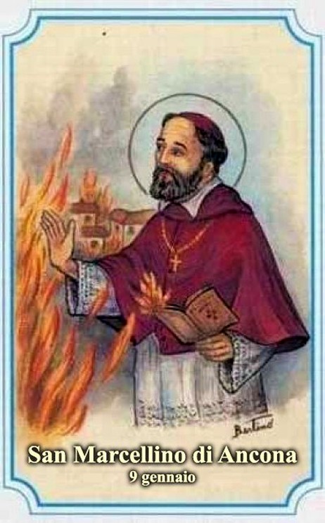 이탈리아 중부 안코나에서 태어난 성 마르첼리누스(또는 마르첼리노)는 6세기 중엽 고향인 안코나의 제5대 주교가 되었다. 그는 단식과 고행을 실천하며 기도와 자선 사업에 헌신했다. 교황 성 대 그레고리오 1세(Gregorius, 9월 3일)는 그의 “대화집”에서 그를 ‘존경받을 덕을 지닌 사람’으로 평했고, 특별히 화재로 인해 안코나가 파괴될 위험 속에서 기적적으로 도시를 구했다고 전해주었다. 후대의 기록에 따르면 바람에 의해 불이 맹렬히 도시를 삼킬 때 주민들의 청을 받은 성 마르첼리노는 통풍으로 인해 움직이기도 어려웠지만, 의자에 실려 불이 가장 심각한 곳으로 가서 복음서를 펼쳐 읽었다. 복음서에 불이 붙어 일부 타기도 했지만, 책을 덮는 순간 도시의 불이 꺼졌다고 한다. 나중에 그 복음서를 만지며 기도하는 사람들의 질병이 치유되는 기적이 일어났고, 그의 축일 전날 복음서를 들고 도시를 행렬하는 관습도 생겼다. 오늘날 화재로부터 도시를 구한 성 마르첼리노의 복음서는 안코나 교구 박물관에 보관되어 있다. 옛 “로마 순교록”과 2001년 개정 발행되어 2004년 일부 수정 및 추가한 “로마 순교록” 모두 1월 9일 목록에서 화재로부터 안코나를 구한 성 마르첼리노 주교에 대해 기록하였다.♣