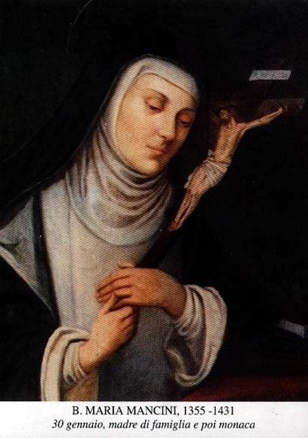 카타리나 만치니(Catharina Mancini)는 피사의 귀족가문 출신으로 이탈리아 내에서 정치적 격동이 소용돌이 칠 당시에 태어났다. 그녀는 어려서부터 환시와 기적적인 일로 유명했다. 다섯 살 때 그녀는 환시 중에 시민의 지도자 중 한 명인 복자 베드로 감바코르타(Petrus Gambacorta, 6월 17일)가 피사의 한 저택 지하 감옥에서 고문을 받고 있는 것을 보았다. 그녀가 간절히 기도했을 때 그를 묶었던 줄이 끊어져 풀려났다고 한다. 그때 성모 마리아가 이 어린 소녀에게 그 남자가 언젠가 그녀의 후원자가 될 것이니 매일 그를 위해 기도하라고 말했다. 카타리나 만치니는 결혼보다는 수도생활을 원했으나 부모의 뜻에 순명해 12살의 나이로 결혼을 하였다. 그러나 16세에 남편을 잃고 어쩔 수 없이 다시 결혼을 하여 7명의 자녀를 두었다. 그러나 25세의 나이에 두 번째 남편과 자녀를 모두 잃고 기도와 애덕에만 전념하게 되었다. 그녀는 엄격한 일정대로 기도와 선행, 단식과 금욕을 실천하였다. 그리고 자신의 집을 병원으로 개조해서 병들고 가난한 이들을 데려와 마치 주님을 섬기듯이 돌보았다. 그 당시 시에나(Siena)의 성녀 카타리나(4월 29일)가 피사를 방문해서 그녀와 함께 거룩한 우정을 맺었다. 카타리나 만치니는 성녀 카타리나의 권유로 도미니코회 재속회원이 되었다. 그러면서 마리아(Maria)라는 이름을 받았다. 마리아 만치니는 복자 베드로 감바코르타의 누이동생인 복녀 클라라 감바코르타(Clara Gambacorta, 4월 17일)와 다른 몇 명의 회원들과 함께 더욱 엄격한 수도생활을 하였다. 그러면서 새롭고 더욱 엄격한 수도원을 설립하게 되는데, 복자 베드로 감바코르타가 그것을 지어주었다. 이로써 그가 미래에 그녀의 후원자가 될 것이라는 동정 마리아의 예언이 이루어졌다. 마리아 만치니는 그녀의 친구인 복녀 클라라 감바코르타가 선종한 후 원장으로서 죽을 때까지 정의롭고 거룩하게 산타 크로체(Santa Croce) 수녀원을 운영하였다. 그녀에 대한 공경은 1855년 교황 비오 9세(Pius IX)에 의해 승인되었다.
