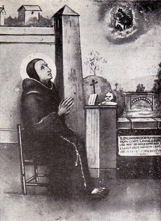 발타사르는 1420년경에 이탈리아 제노바(Genova)의 치아바리에서 태어났고, 프란치스코회에 입회하여 서원하고 서품을 받았다. 그는 펠트르(Feltre)의 성 베르나르디누스(Bernardinus)와 친구이자 동료 설교자였다. 베르나르디누스와의 선교여행은 거의 항상 성공하였으나, 건강이 악화되어 오래 지속하지는 못하였다. 그가 걸을 수 없게 되었을 때에는 주로 고해신부로 일하였고, 열심히 미사를 봉헌하여 큰 감명을 주었다. 또한 그는 자주 숲 속으로 들어가서 오랫동안 명상에 잠기거나 독서에 열중하였으며, 종종 성모의 환시를 보았고, 폭설이 쏟아질 때 기적적으로 피난처를 구하기도 하였다고 전해온다. 발타사르는 1492년 10월 7일에 운명하였고, 1930년에 그에 대한 공경이 승인되었다.