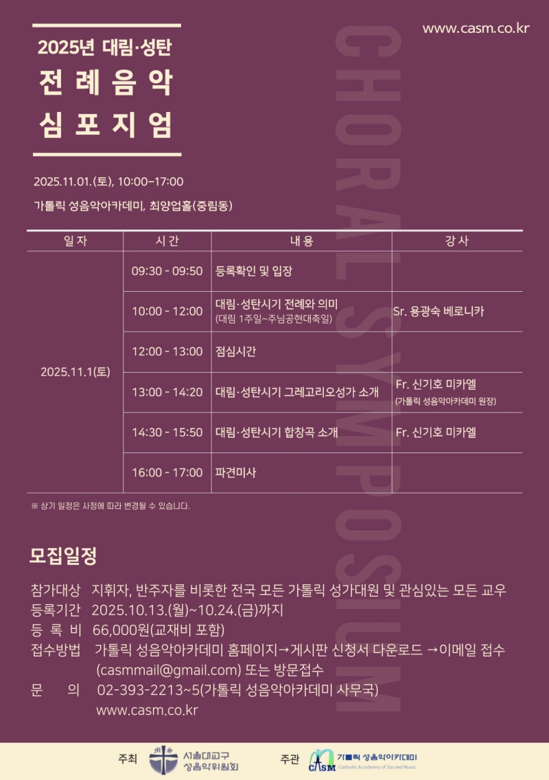 - 문의: 02-393-2213~5 (가톨릭 성음악아카데미 사무국), www.casm.co.kr