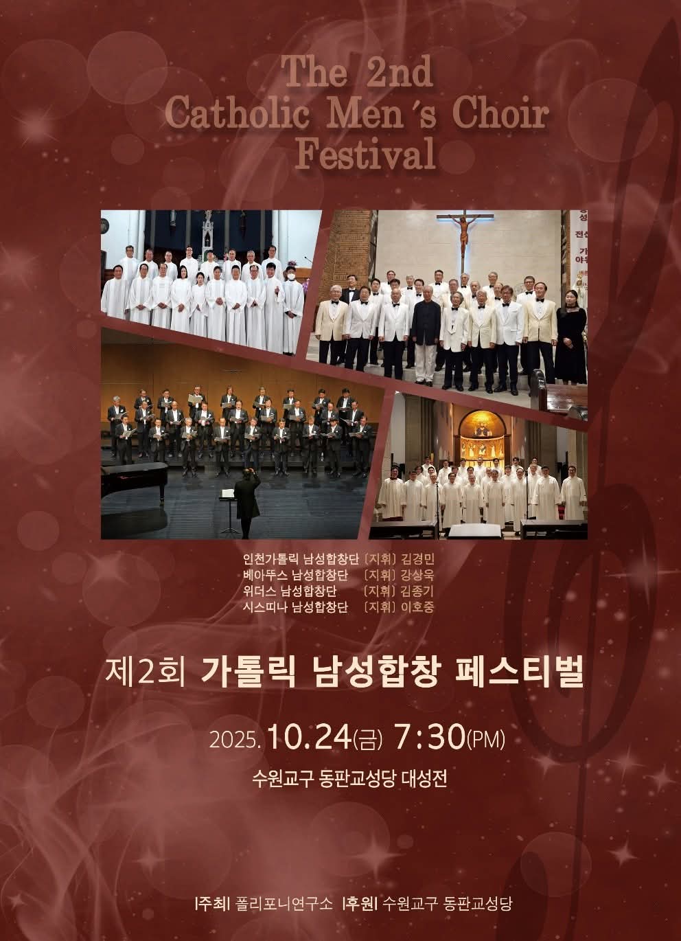 각 합창단의 남성합창 연주를 통한 많은 아름다운 성음악의 보급과 전파와 더불어 다양한 음악을 통해 특유의 멋진 하모니를 선보이는 연주로 함께 주님을 찬미하며 노래하는 가운데 음악적으로 더욱 발전해 나가는 계기를 만드는 속에 각 교구 교회음악 발전의 토대를 위해 마련된 뜻깊은 교회음악 축제의 무대 제2회 가톨릭 남성합창 페스티벌에 교회음악을 사랑하시는 많은 교우님들의 관심과 격려 부탁드립니다