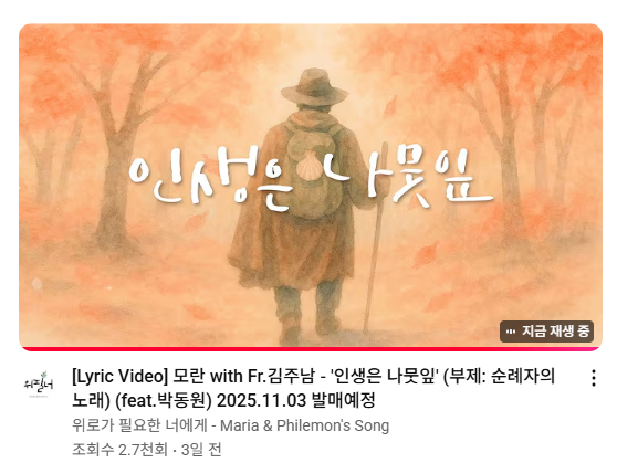 | 제목 | [Lyric Video] 모란 with Fr.김주남 - '인생은 나뭇잎' (부제: 순례자의 노래) (feat.박동원) | |||