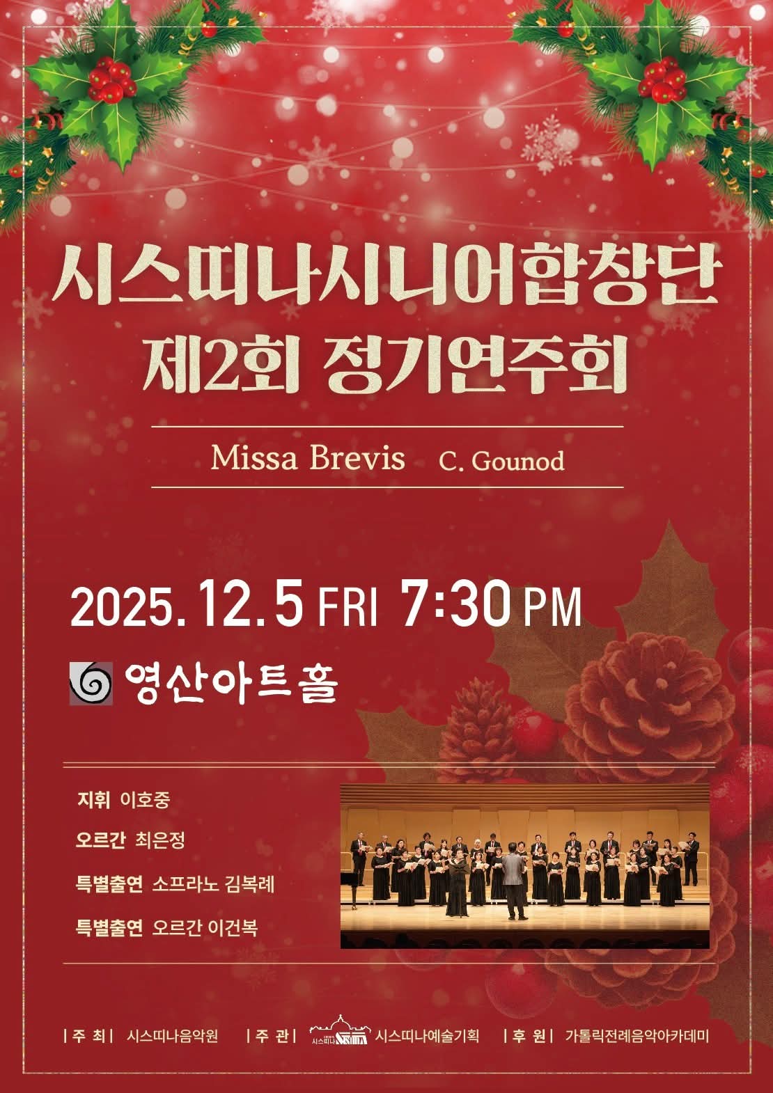 다가오는 12월 대림시기에 작년 10월 안토니오 비발디의 글로리아로 창단연주회를 성공적으로 봉헌한 시스띠나시니어합창단이 다가오는 12월5일 대림 제1주간 금요일에 두번째 정기연주회를 영산아트홀 에서 봉헌합니다