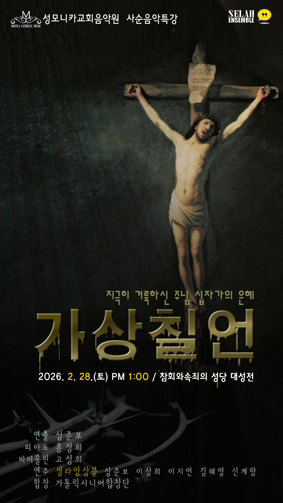성모니카교회음악원의 찬양크루 <SELAH ENSEMBLE "셀라앙상블">에서 연주하고 가톨릭시니어합창단이 합창하는 사순 음악특강 "지극히 거룩하신 주님 십자가의 은혜" 【 가상칠언 】